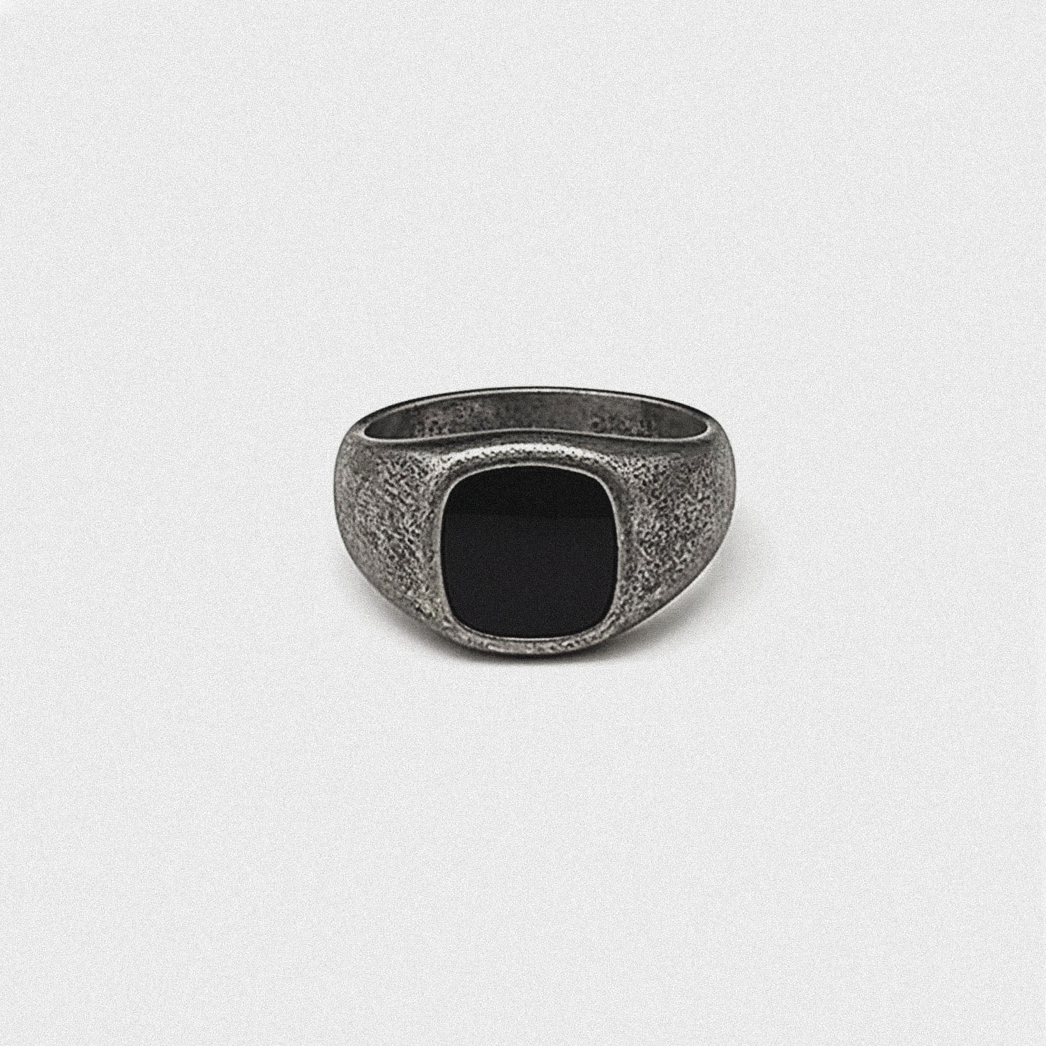 A classic signet built with a rugged vintage finish and anchored by a bold Onyx stone.